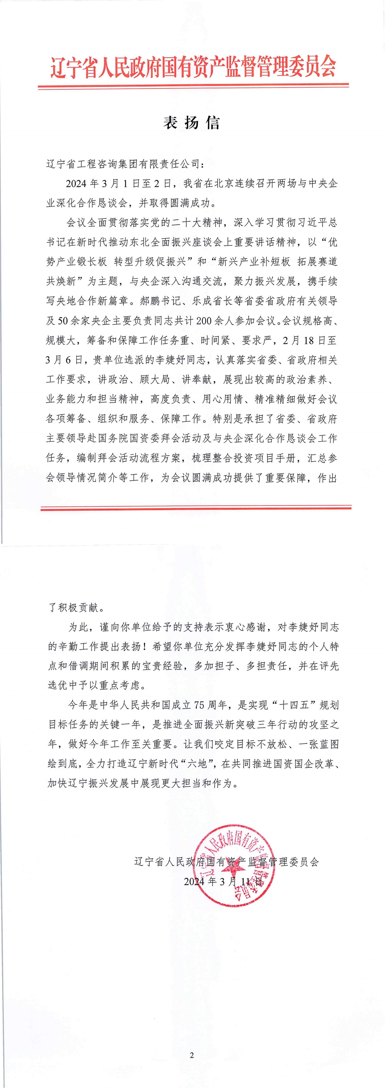 信中指出,李婕妤同志认真落实省委、省政府相关工作要求,讲政治、顾大局、讲奉献,展现出较高的政治素养、业务能力和担当精神,高度负责、用心用情、精准精细做好会议各项筹备、组织和服务、保障工作。特别是承担了省委、省政府主要领导赴国务院国资委拜会活动及与央企深化合作恳谈会工作任务,编制拜会活动流程方案,梳理整合投资项目手册,汇总参会领导情况简介等工作,展现了集团干部职工昂扬向上的精神风貌,为会议圆满成功提供了重要保障,作出了积极贡献。