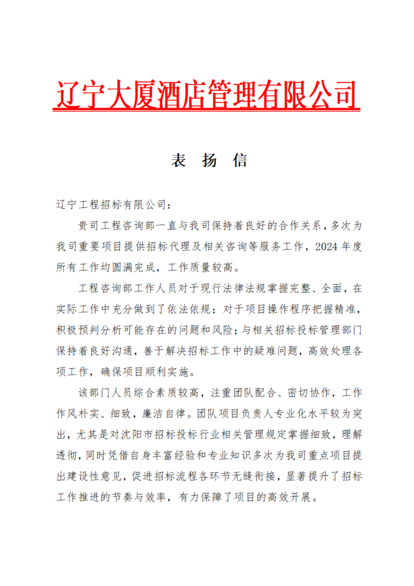 近日,时搏网页版登录入口收到辽宁大厦发来的表扬信,对时搏网页版登录入口业务团队在招标代理及相关咨询服务等工作中表现出的丰富经验和专业水平表示认可。